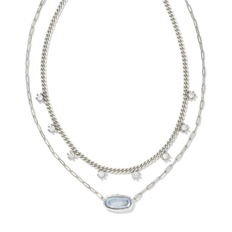 Introducing the Kendra Scott Framed Elisa Rhodium Plated Opalite & Pearl Multi-Strand Necklace, a stunning piece from the renowned brand Kendra Scott. This necklace is crafted with rhodium plated brass and features exquisite gemstones including opalite and mother of pearl. The pendant drops approximately 0.61 inches, and the necklace is approximately 16 inches long with a 3-inch extender for a customizable fit. The lobster claw clasp closure ensures secure wear. Treat yourself to this playful, effortless, and trendy accessory that is sure to elevate any outfit. Please note that gemstones may have undergone treatment for enhanced color and durability, and may require special care for lasting beauty. Elevate your style with the Kendra Scott Framed Elisa Rhodium Plated Opalite & Pearl Multi-Strand Necklace today.