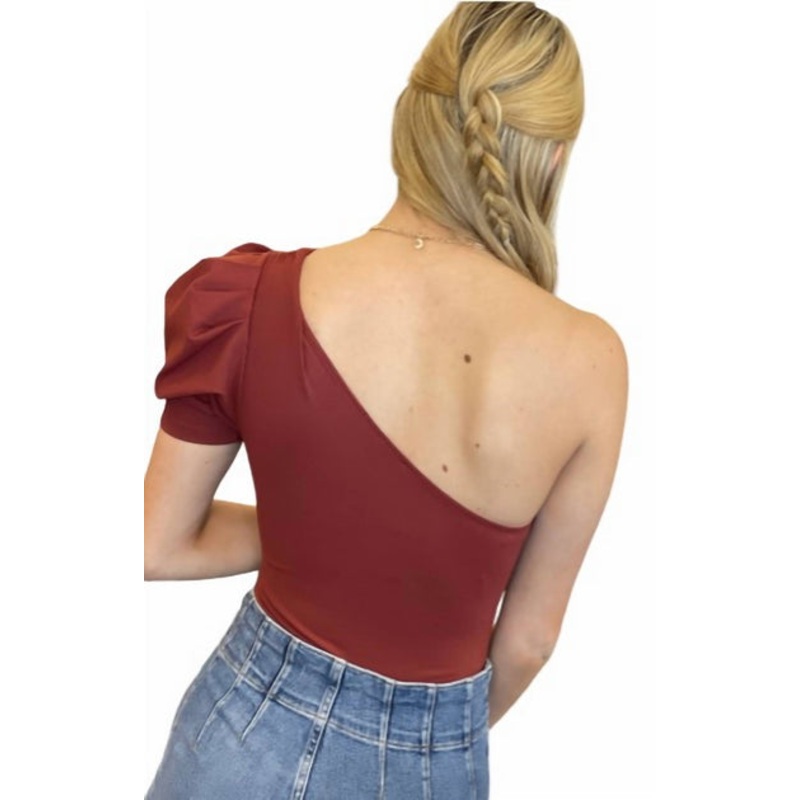 One shoulder puff sleeve bodysuit. Thong bottom. Snap details. 88% Nylon, 12% Spandex. Machine wash cold with like colors. Only non-chlorine bleach when needed. Line dry. Cool iron if needed. Imported